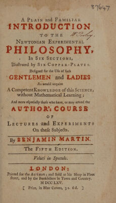 A plain and familiar introduction to the Newtonian experimental philosophy. In six sections; illustrated by six copper-plates. Designed for the use of such gentlemen and ladies as would acquire a competent knowledge of this science without mathematical learning; and more especially those who have, or may attend the author's course of lectures and experiments on these subjects / By Benjamin Martin.