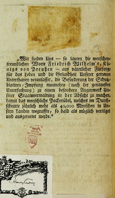Oeffentliche Anstalten : die Blattern, durch die Einimpfung der Kuhpocken, auszurotten / Nebst der ältesten Urkunde von den Kuhpocken, und einer beyliegenden Volkschrift: zuruf an die Menschen.
