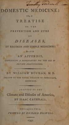 Domestic medicine: or, A treatise on the prevention and cure of diseases, by regimen and simple medicines: with an appendix, containing a dispensatory for the use of private practitioners / By William Buchan ... Adapted to the climate and diseases of America, by Isaac Cathrall.