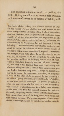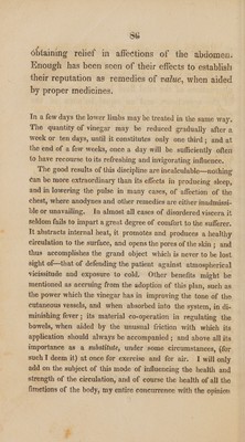 ![Sd iast can be borne, and a eomfortable train of symp- toms ensues, with moderate reaction, then the benefit will be considerable, since these healthy alternations of the vital fluid lead to a restoration of the secretions, and an equal balance of the excitability and circulation throughout the system. Before I dismiss the subject of bathing, I would mention the well-known mode of sponging the body with vinegar and water, after the method of Dr. Stewart in affections of the chest ; the good effects of which cannot be too highly stated, whether we consider it as intermediate between warm and cold immersion, or as a means of obtain- ing those ends for which cold bathing is prescri- bed.* Nor would I pass over the no less useful] expedients of Dr. Scottf and Dr. Thomas,{ for * With a view to remove any impediment which may stand in the way of a more extended use of this valuable remedy, I am induced to give at this place specific directions respecting it. The method is simply this :—Rub in either with the hand or with a sponge, night and morning, equal parts of vinegar and water, as if using an embrocation, all over the surface of the arms, throat, neck, chest, back, stomach and bowels—let the mixture be used tepid for the first three or four times, and then quite cold; first dry the skin with a coarse towel, and then rub it, for at least ten minutes, with flannel or a flesh-brush. { The Nitro-Muriatic Bath. { The occasional application of leeches to the anus, and the more habitual use of simple injections. ; Lunt &](https://iiif.wellcomecollection.org/image/b33028965_0091.jp2/full/800%2C/0/default.jpg)