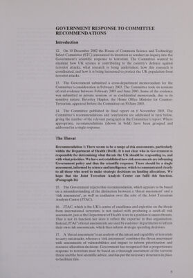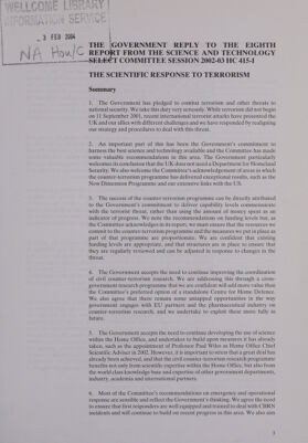 The scientific response to terrorism : the Government reply to the eighth report from the House of Commons Science and Technology Select Committee : session 2002-2003.