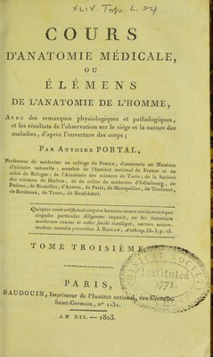Cours d'anatomie médicale, ou, Élémens de l'anatomie de l'homme : avec des remarques phsyiologiques et pathologiques, et les résultats de l'observation sur le siége et la nature des maladies, d'après l'ouverture des corps / par Antoine Portal.