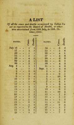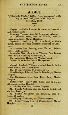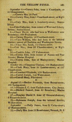 Credit: An account of the yellow fever...in the city of New York, in the year 1822 : to which is prefixed a brief sketch of the different pestilential diseases, with which this city was afflicted, in the years 1798, 1799, 1803 & 1805, with the opinion of several of our most eminent physicians, respecting the origin of the disease, its prevention and cure...list of...deaths by yellow fever... / taken from official documents. Source: Wellcome Collection.
