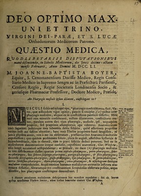 Credit: Quaestio medica ... An pharyngis musculi ipsum dilatent, constringantve? / [Jean Honoré Petiot]. Source: Wellcome Collection.