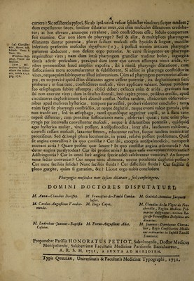 Quaestio medica ... An pharyngis musculi ipsum dilatent, constringantve? / [Jean Honoré Petiot].