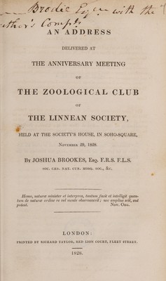 An address delivered at the anniversary meeting of the Zoological Club of the Linnean Society / [Joshua Brookes].