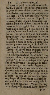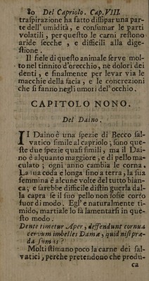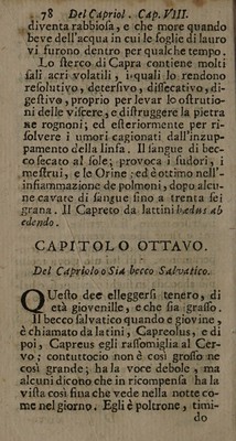 ![Del Capretto i Cap VIL ‘17 ‘certo paefe ‘della Scozia foho di’ colo giallo je che hanno identi di color d- oro. In Affrica nafcono con le corna è e nel Ponte mai ne portano. © Il Caftrato! da Latini} Verver ab inverfiti ademptifque teffibus. © © CAPITOLO SETTIMO. ‘Del € apretto ] Gli dee elleggerfi molto giovine; cioè chelattiancora, che non abe bia ancor mangiato dell’ herba. Si dee ancor effaminar fe la fina madre non ha alcun male’, e s'è ben niitrita. Allora nutrifce molto , fi digerifce facilmen- te; e tiene libero ilventre. Conviene in ognitempo,età, e tem- peramento. Idi lui ufo giova molto a:gli:covalefcenti. Più egl’è giovine, più abbonda in fughi oleaginofi e bal- famici, che lo rendono »nutritivo,;e proprio 2 produrre tuttiquefti buoni | effetti. La morficatura delle capre è molto dannofa ‘all’erbe ; In oltre fi dice che Palbero dell’ Olive dopo efser ftato qualche poco rofo:da quefto ani- «male, ch’egli diventa fterile, e che per quefto non s'immolava la Capra da Pagani à Minerva . Si dice ancora, che quando ella mangia del Bafilico,](https://iiif.wellcomecollection.org/image/b33005436_0091.jp2/full/800%2C/0/default.jpg)
