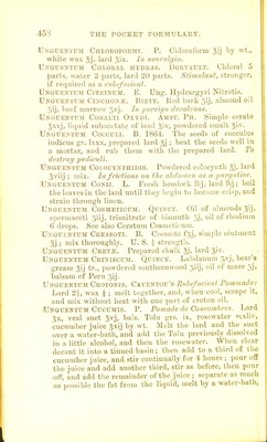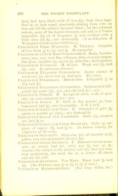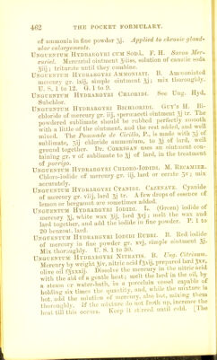 ![of ammonia in fine powder 5j. Applied to chronic gland' ulwr tnlargements. Unguentum Hydeaegybi ctjm Soda. F. H. Savon Mer- curiel. Mercurial ointment giiiss, solution of caustic soda giij ; triturate until they combine. Unguentum Hydeargyei Ammoniati. B. Ammonnited mercury gr. Ixij, simple ointment ; mix thoroughly. U. S. I'to 12. G. 1 to 9. Unguenttjm Hydeaegyei Chloeidi. See Ung. liyd. Subchlor. , Unguentum Hydeaegyei Bichloeidi. Guys H. bi- chloride of mercury gr. iij, spermaceti ointment 3J ir. ihe powdered sublimate should be rubbed perfectly smooth with a little of the ointment, and the rest acided, and ^yeIl mixed. The Fommade de Cirillo, P., is naade with 5] ot sublimate, 5ii chloride ammonium, to 33 of lard, well ground together. Dr. Coerigan uses an ointment con- taining gr. V of sublimate to of lard, in the treatment of porrigo. Unguentum Hydeaegyei CnLOEO-IoDiDi. M. Kecamiee. Chloro-iodide of mercury gr. iij, bird or cerate ; mix accurately. ^ n -t^ Unguentum Hydrargyei Cyanidi. Cazenate. Cyanide of mercury gr. viij, lard 3} ^v. A few drops of essence of lemon or bergamot are sometimes added. . Unguentum Hydrargyri Iodidi. L. (Green) iod.de of mercury 5.). wLite wax gij, lard pi; melt the wax and lard together, and add the iodide 111 fine powder. 1. 1 to 20 beuzoat. lard. t. i- t^, Unguentum Hydrargyei Iodidi Rubri. B. Bed loiudc of mercury in fine powder gr. xvj, simple ointment 51. Mix thoroughly. U. S. 1 to 30. r;,.;,„„„ Unguentum Hydeargyei Nitratis. B. I ng Chnum. Mercury by weight 'iv, nitric acidf^xij, prepared ar.l 5x7. 0 ive oil fVcxxii! Dissolve the mercury in the nitric ac.d w th tlic'^id of a gentle heat; melt the lard in the m . by a ' earn <.r watci-bath, in a porcelain vessel capable of ho di g six times the quantity, and, while the mixture ,s ho add the solution of mercury, also hot, mixing them S ;<m^,lv. If U.e mixture do not froth up, nicrea.e the heat till tins occurs. Keep it .^t rred until cohl. [Ihe](https://iiif.wellcomecollection.org/image/b21687778_0474.jp2/full/800%2C/0/default.jpg)