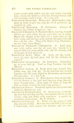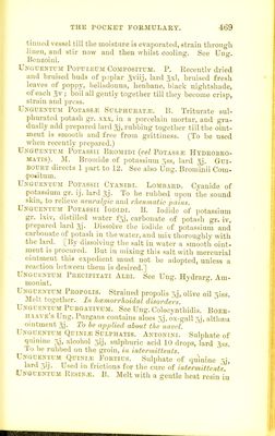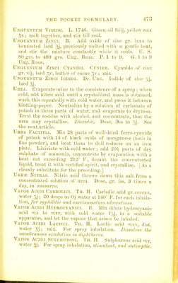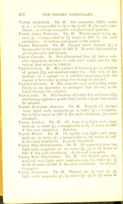 ![Vapoe AMMONiiE. Tn. H. Sol. iimmoniiB (•959), water p. tc. ; a teaspoor.ful in Oj \v;iter at 80° F., for each inlia- iatiou ; in chronic lari/iiffitis and functional aphonia. Yavou Amyl NiTEiTis. Th. H. Nitrite am>l iviij, sp. rect. 5j; a teaspoonful in Oj water at 100*^ F., for each iulialation.- In asthma and spasm of the glottis. Vapor Benzoini. Th. H. Compel, tinct. benzoin % ; a teaspoonful to Oj water at 140° F. In acute inJJanimation of the pharynx and larynx. Vapok Chloei. B. Pnt chlorinated lime sij into a suit- able apparatus, moisten it with cold water, and let the vapour that arises be inhaled. Vapoe Coni.i;. B. Mix extract of lieraloik gr. Ix, solution of potash f5i, and distilled water f5x. Put mxx of the mixture on a sponge in a suitable api>ariitus, that the vapour of hot water passing over it may be inhaled. Vapor Ceeasoti. B. Mix creasote mxij, and boiling water fgviij, in au apparatus so arranged that air may be in- haled through the solution. Vapor Iodi. B. Mix tincture of iodine f3j, and water f^j, and having applied a gentle heat, let the v.ipour that arises be inhaled. Vapor JtrniPEEi Anglici. Th. H. English oil juniper rnxx, light carb. magnesia gr. x, water gj ; a teaspoon- ful to Oj of water at 140° F. for each inhalation -.for vocal tvealcness. Vapor Ltjptjli. Th. II. 01. hops invj, light carb. mag- nesia gr. X, water 5,); a teaspoonf ul to Oj of water at 140^ F. for each inhalation. Sedative. Vapoe Myrti. Tn. H. 01. myrtle ivj, light carb. mag- nesia gr. vj, water 5j; a teaspoonful in Oj water at 140' F. for eacli inhalation. In acnte ton.tillitis. Vapoe Pini Plumiliokis. Tn. H. 01. mountain pine ^ss, light carb. magnesia cr. xv, water 5,]; 3j to Oj water at 140° F. for each inhalation. In chronic hu-i/ngitis. Vapoe Pjni Stla^f.steis. Tii. H. Oil Scotch pine (fir- wool oil) nxl, light carb. magnesia grs. xx, water ; oj to Oj of water at 110° F. for each exhalation. In chronic larijiir/i/i.w Vapor'Tiiymolis. Th. II. Thymol, gr. vj. red. sp. 5,1, light carh. magnesia gr. iij, water 5j—5j to Oj water at](https://iiif.wellcomecollection.org/image/b21687778_0486.jp2/full/800%2C/0/default.jpg)