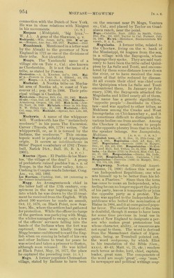 ![MSEPASK—MUGWUMP fB. A. E. connection with the Dutch of New York. He was in close relations with Ninigret in his movements. (^’-T.) Msepase {MhhtpeslU, ‘big lynx.’— W. J.). A gens of the Shawnee, q. v. Meshipeshi.—Win. Jone.s, iiil’n, 1906. M'-se'-pa- Morgan, Anc. Son., 168,1877. Panther.—Ibid. Muanbissek. Mentioned in a letter sent by the Abnaki to the governor of New England in 1721 as oneuf the divisions of their tribe. Not identilied. Muayu. The Yaudanchi name of a village site on Tale r., Cal.; also known as Chesheshim. It is not the name of a tribe, as stated by Powers. Chesheshim.—A. L. Kroeber, inf’ii, 1903. Mai- ai'-u.—Powers in Cont. N. A. Kthnol., iii, 370, 1877. Muayu.—.V. L. Kroeber, inf’n, 1906. Muchalat. A Nootka tribe on Mucha- lat arm of Nootka sd., w. coast of Van- couver id.; pop. 62 in PJ06. Their prin- cipal village is Cdieshish. Match-clats.—Mayne, Prit. Col., 231,1862. Match- itl-aht.—Can. Ind. AH'. 1884,186,1885. Michalits.— Armstrong, Oregon, 136, 1857. Mich-la-its.—Jew- itt, Narr., 36, 1849. Mo'tclath.—Boas in 6tli Hep. N. W. Tribes Can., 31, 1890. Muchalaht.—Brit. Col. map, 1872. Muchlaht.—Sproat, Sav. Life, 308, 1868. Muckawis. A name of the whippoor- will. Wordsworth has the “ melancholy muckawis'’ in his poem The Excursion. Carver (Travels, 468, 1778) writes, “the whipperwill, or, as it is termed by the Indians, the mackawiss.” This onoma- topoeic word is probably of Algonquian origin. It occurs as muckkowhecsce in Stiles’ Pequot vocabulary of 1762 (Trum- bull, Natick Diet., Bull. 25, B. A. E., 1903). (a. f. c.) Muertos (^pan.: El Pueblo de los Muer- tos, ‘the village of the dead’). A group of prehistoric ruined pueblos 9 m. s. e. of Tempe, in the Salt River valley, Ariz.— Cushing in Compte-rendu Internat. Cong. Am., VII, 162, 1892. Los Muertans.—Cnsbing, ibid., 168 (referring to the former inhabitants). Mugg. An Arosaguntacook chief in the latter half of the 17th century, con- spicuous in the war beginning in 1675, into which he was drawn by the ill-treat- ment he received from the English. With about 100 warriors he made an assault, Oct. 12, 1676, on Black Point, now Scar- boro, Me., when' the settlers had gathered for protection. While theothcer in charge of the garrison was parltyving wit h -Mugg, the whitesmanagi'd to escajie, only a few of the oflicers’ servants falling into the hands of the Indians wdien the foit was captured; these were kindly treated. Mugg became embittered toward the Eng- lish when on (lomingin behalf of his own and other Indians to treat for peace he was seized and taken a jirisoner to Boston, although soon released, lie was killeil at Black Point, i\lay, 16, 1677, the j>lace he captured the [ireceding year. (c. t. ) Mugu. A former poinilous Chumashan village, stated by Indians to have been on the seacoast near Pt Mugu, Ventura CO., Cal., and placed by Taylor on Guad- alasca ranch, near the jioint. Mugu.—Cabrillo, Narr. (1512) in Smith, Colec. Doc. Fla., 181, 1857; Taylor in Cal. Farmer, .Inly 24, 1863. Mu-wu.—Hen'shaw, Buenaventura MS. vocab., B. A. K., 1884. Mugulasha. A former tribe, related to the Choctaw, living on the w. bank of the iMississippi, 64 leagues from the sea, in a village with the Bayogoula, whose language they spoke. They are said vari- ously to have been the tribe called Quini- pi.ssa by La Salle and Tonti, and encoun- tered by them some distance lower down the river, or to have received the rem- nants of that tribe reduced by disease. At all events their chief was chief over the (.)uinij)is.<a when La Salle and Tonti encountered them. In January or Eeb- rnary, 1700, the Bayogoula attacked the Mugulasha and killeil nearly all of them. The mime has a generic signilicution, ‘ op[)osite jieople ’—Imukiasha in Choc- taw—and was applied to other tribes, as Muklas.«a among the Creeks and West Imongolasha on Chicka^awhay r., and it is sometimes ditiicult to distinguish the various bodies one from another. Among the C’hoctaw it usually refers to jieople of theopjio.site phratry from that to which the speaker belongs. See Imongulasha, Mukiassa. (a. s. cl .i. b. s.) Moglushah town.—H. K. Doc. 15, 27th(;ung., 2<1 .se.ss., 5, 1841. Mogolushas.—1ml. AIT. Kep., 877, 1847. Mogoulachas.—Sail vole (1699) in Margry, Doc., IV, 4.53, 455, 1880. Mongontatchas. — McKcn- ucy ami Hall, Iiul. Tribes, in, 81.1858. Mongou- lacha.—La Harpe (1723) in French. Hist. Coll. La., ni, 17, 1851. Mongoulatches.—Drake. Bk. liids., i.x, 1848. Mougolaches.—Coxe, Carolami, 7, 1741. Mougoulachas.—Iberville (1699) in Margrv, Dec., IV, 113, 119, 124, l&SO. Mugwump. Norton (Political Ameri- canisms, 74, 1890) delines this word as “an Independent Republican; one who sets himself up to be lietter than his fel- lows; a Pharisee.’’ Since then the term has come to mean an Independent, who, feeling he can no longer sujijiort the policy of his party, leavc'S it tc'inporarily or joins the opjiosite party as a jmitest. The term was applied to the Independent Ke- publicans who bolted the nomination of Blaine in 1884, and it at once gained ))0])U- lar favor. Thet'arlier history of the term is doubtful, though it seems to have been for some time previous in local use in jiarts of New England to designate a jier- son who makes grc'at jiretensions but who.se character, ability, or resources are not eipial to them. The word is derived from the Massachuset dialect of .\lgon- qiiian, being, as Trumbull pointed out, the word mukguomp, by which Eliot in his translation of the Uible (Gen., xxxvi, 40-43; ]\Iatt. vi, 21, etc.) renders such terms as duke, lord, chief, cajitain, leader, great man. The compoiu'nts of the word are vuKjki ‘grc*at’,‘man.’ In newspajK'r and iiolitical writings iinig-](https://iiif.wellcomecollection.org/image/b24881739_0972.jp2/full/800%2C/0/default.jpg)