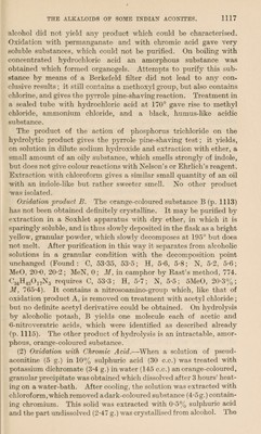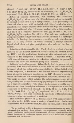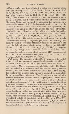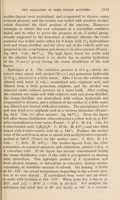 ![mother-liquors were neutralised, and evaporated to dryness under reduced pressure, and the residue was boiled with absolute alcohol, wdiich dissolved the third product of the reaction. Numerous I attempts to obtain this new substance in a crystalline condition I failed, and in order to prove the presence of an A-acetyl group, I already suggested by the formation of nitrosyl chloride, the crude I material was boiled under reflux for 6 hours with 1% hydrochloric I acid and steam-distilled, and the silver salt of the volatile acid was I prepared in the usual fashion and shown to be silver acetate (Found : 1 Ag, 64-5. Calc., 64-7%). The high figure found for acetic acid I in the alkaline hydrolysis is no doubt due to partial hydrolysis 9 of the AT-acetyl group during the steam distillation of the acid l! liquor. Hydrolysis of A. The oxidation product A (3-5 g.) slowly dis- | solved when mixed with alcohol (70 c.c.) and potassium hydroxide | (1-75 g.), dissolved in a little water. After 2 hours the solution was j diluted with water (3 vols.), neutralised with sulphuric acid, and if filtered from a little potassium sulphate, and the alcohol was f removed under reduced pressure on a water-bath. After cooling, I the solution was made acid with sulphuric acid and steam-distilled, I the steam-distillate was neutralised with sodium hydroxide and % evaporated to dryness, and a solution of the residue in a little water f was filtered and treated with silver nitrate. The precipitated silver r salt was dried over sulphuric acid in a vacuous desiccator (Found : A Ag, 64-3. Calc, for silver acetate : Ag, 64-7%). From the liquor 9t| left after steam distillation, ether extracted a yellow acid, m. p. 195° yj after crystallisation from water (Found : C, 47-2 ; H, 4-4. Calc, for 4 6-nitroveratric acid, C9H906N : C, 47*55; H, 4*0%) and also when Gf) mixed with 6-nitroveratric acid (m. p. 194°). Further, the methyl ijj ester of the acid from A, alone or mixed with methyl 6-nitroveratrate, cti melted at 143*5° (Found for the methyl ester : C, 49*3; H, 4*8. 4j Calc.: C, 49*8; H, 4*6%). The mother-liquors from the ether « extraction, on repeated agitation with chloroform, yielded 1*25 g. of i a colourless solid. If the liquor has become concentrated during d; the steam distillation, some of this solid is precipitated on shaking n writh chloroform. This hydrolytic product of A crystallises well d from alcohol, benzene, or chloroform in colourless, shining needles ol containing an indefinite amount of solvent. On heating, it froths )j at 85—115°, the actual temperature depending on the solvent used, i<; but in no case sharply. If crystallised from water and air-dried, i it melts with frothing at 165—170°. When quite dry, it has m. p. L! 215°, and [<x]g5 + 30*9° (c = 0*59, in alcohol). For analysis the ii substance was dried first at 80c and finally at 140 in a vacuum](https://iiif.wellcomecollection.org/image/b30627217_0013.jp2/full/800%2C/0/default.jpg)