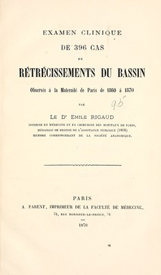 Examen clinique de 396 cas de rrissements du bassin : observ a la maternitde Paris de 1860 a 1870 / par Emile Rigaud.