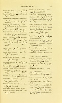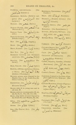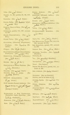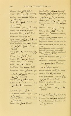 ![K«0oi;pa. [See^^lj Kafur.] KsyXPoe- [See Jiioars.} •* • KrjKiSiov. [See ’Afsah, or Ktipog. [See Shama’; also Kidnet-bean. [See ^1-..^ LubiA.'] Ktrrof. [See Child/.'] 1LoKKV[iri\ka. [See Ijjns.] • » 'K.oXoKvvOa. [See C *3 Kar'.] Ko/ijut ’EXato)v. [See ,. i J t Samagu-z-zaitun.]^-^ ^ Kofiin ’Apa(3iKov. [See Samag, or Sainagu-l- ’Arab't.] KoTTpog. [See JEJ Bar; also , Vj\ Zibl.] K-dxXoe- [See Cuhl.] Kpap^g. [See Carainb.] Kpivov. [See Susan.] Adiradov. [See Hummdd.] Lemnian Earth, Lernnia Teira, or Teii'a sigillata, Agp,via yfj. [See Tin Alachtum.] Lentile, Lens. [See ’Adas.] Lepidium sativum. [See Hurf. KpiOf]. [See^ Sha’ir.] KpoKodiiXog. [See Bab.] ♦ • KpoKoXvrgg. [See Hu- dad; also Z. ’Anzarut, or Anzarut.] ILvapog. [See Bdkila.] TLudtia and Kcodsia M^Kotpog. [See ^ A.-n. Chashchdsh.] Lac, Milk. [See Laban.] Lac, Laccae Gummi, Aaxdv. [See CiS3 Lac.] Lactuca, {Lactuca sativa.) [See Mi * Chass. Lamb. [See Haiiuil.] Mi * Lettuce. [See Chass.] Ai(iavog. [See Cundur.] Liber de Abbrbviationibus, quoted, 105. Liber ad Almansorem, quoted, 71; extract from, 77, &c. Liber Continens, extract from, 99, &c. Liber Diyisionum, extract from, 89, &c. Liber Liberationis, quoted, 107. Liber Memorialis, quoted, 124. Lilt, Lilium, {Lilium candidum.) [See ^ Susan.] Liquorice, Liquiritia. [See / Siis.] ^ Litharge, Litliargyrum, AiGupyvpog. [See MarddsanJ ; also AfMJ’tac.] Locust, Locusta. [See Jardd.] AoipiKT], [See Jadari.] Long Birthwort. [See Zirdwand Tamil.] Lupine, {Lwpinus Terines.) Tarmas.] Lycium, Avkiov. [See Hudad.] [See 'M.aXdxyp [See A .-x.Mulnchiah.] Mallow. [See A Mtduehiah.] Malum Punicum, or Granatuin. [See Itummdn.]](https://iiif.wellcomecollection.org/image/b21301943_0216.jp2/full/800%2C/0/default.jpg)