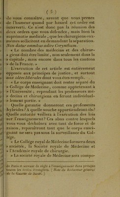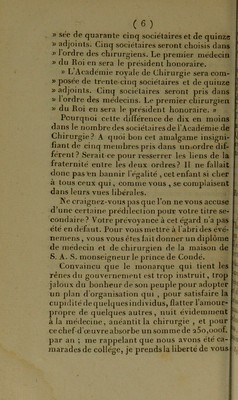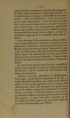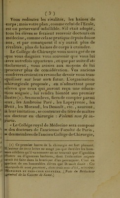 ![Lettre de M. Marquais, chirurgien^ à M.Sedillot^ rédacteûr du Journal général de Médecine. IN*! O N s I E O R , Tous les amis de l’humanité verront avec ])laisir qu’en votre qualité de vous signaliez les .vices de l’organisation de l’Ecole actuelle de Médecine, que vous décla- riez franchement que rien, dans cette nouvelle institution, « n’a remplacé ces corps antiques ï) et révérés, l’ancienne Faculté de nié<lecine » de Paris et le College deChirurgie , cette école » fameuse où les étudians de l’une et de l’autre » branche de l’art de guérir venaient se rendre )) de toutes parts; ces deux Académies, l’orgueil » de la nation , la Société royale de Médecine » et l’Académie royale de Chirurgie. D’après un pareil début, calqué sur le rap- port et 1 adresse au Roi, dont vous avez entendu diverses lectures dans les assemblées des chi- rurgiens de Paris , il est facile d’apercevoir qu’il ne fallait rien moins que la production plus vaste et plus conforme aux lumières de ce siècle, présenté au ministre de l’intérieur par l’Ecole de Médecine, pour vous déterminer à 'VOUS joindre à elle pour solliciter la continua- tion de la réunion de ces deux corps qui se sont ' illustrés pendant leur séparation , et qui ont cessé d’être du moment qu’ils ont été réunis. Pour remedier aux vices de celte réunion ,](https://iiif.wellcomecollection.org/image/b22386762_0003.jp2/full/800%2C/0/default.jpg)