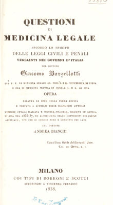 Questioni di medicina legale secondo lo spirito delle leggi civili e penali veglianti nei governi d'Italia ... Opera rifatta da esso sulla forma antica e portata a livello delle cognizioni attuali / [Giacomo Barzellotti].
