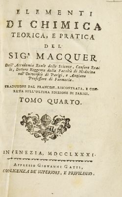 Elementi di chimica teorica, e pratica / Del Sigr. Macquer ... ; Traduzione dal francese riscontrata, e corretta sull'ultima edizione di Parigi.