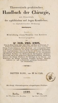 Theoretisch-practisches Handbuch der Chirurgie, mit Einschluss der syphilitischen und Augen-Krankheiten in alphabetischer Ordnung. Unter Mitwirkung eines Vereins von Aerzten und Wundärzten / herausgegeben von Dr.Joh. Nep. Rust.
