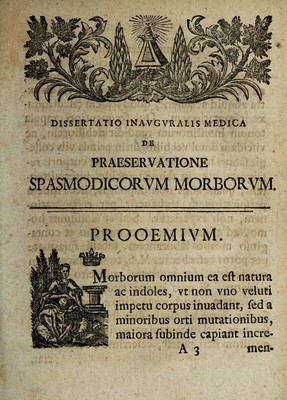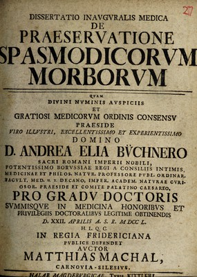 Credit: Dissertatio inauguralis medica de praeservatione spasmodicorum morborum ... / [Matthias Machal]. Source: Wellcome Collection.