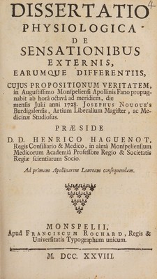 Dissertatio physica de sensationibus externis, earumque differentiis, : Cujus propositionum veritatem, in Augustissimo Monspeliensis Appollinis Fano, propugnabit ab horâ octavâ ad meridiem, die mensis Julii anni 1728. Josephus Nougue's, Burdigalensis Artium Liberalium Magister, ac Medicinae studiosus. / Praeside D. D. Henrico Haguenot.