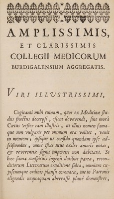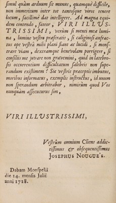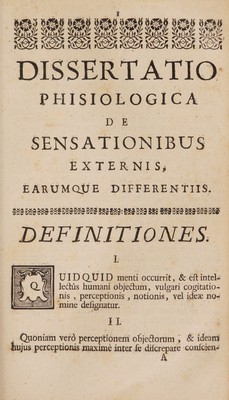 Credit: Dissertatio physica de sensationibus externis, earumque differentiis, : Cujus propositionum veritatem, in Augustissimo Monspeliensis Appollinis Fano, propugnabit ab horâ octavâ ad meridiem, die mensis Julii anni 1728. Josephus Nougue's, Burdigalensis Artium Liberalium Magister, ac Medicinae studiosus. / Praeside D. D. Henrico Haguenot. Source: Wellcome Collection.