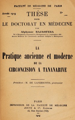![l’Assistance médicale indigène a Madagascar f ~ , .... . I1:' ,, ;. : .. » ■ r lié-'' V’.; ' iv,: 'Y.'- ' ' YY ' ïjêft'Afwéçm;^© ; ■ ' professeur ■ ■. rS v . - ’/i » ■V Y Yi--v,- -!h FACULTÉ DE MÉDECINE DE PARIS f'$ .'N* Annéb 1919 ' V yak mm inRS* ~W mmm LUA- THÈSE ipl§S i ï§fjp I. It-U\i0ir- ,,■ ■ ViV v v..-ï * * : . : ;A Âé ■ mbit P,f‘W; Ï‘ ]>?>;. 7V> r,,VV » : ' : ■. .: ' -‘ ' \, v '■ ' ’ 1 Alphonse RAJAOFE.lt A Né à Mangatany (Tananarive, Madagascar), le 7 septembre x883 H&îfc ■ • -: : A?Ç*g M « m: #» ancienne DE LA f|§f CIRCONCISION A TANANARIVE ■ ••,''' < -, ■ « : j§ M4ÿ fît* ; 3Wr^w $*$£&* m'mmm ■*■ .Was^-.fé îfewip^ wjk! y&g sfe - ; ; --. * i». '. •■-• œ - c Y v.. *-;,v.v -. . fi - •. •ifc.'a* : ■i\z, \ r y, - r ,■ Président : M. DE LAPERSONNE mm S^éMü®ie >! ^ J î,. m s • - ■ '-* * J>i*vV . J .'jy-A'-.â'-'.'ifj PARIS Niv.^-rrAn' IMPRIMERIE DE LA FACULTÉ DE MEDECINE RSiSpAr EæVt P 4 a\üp l! Mla ^ JOUVE & 'G1-, Editeurs i5. Rue Racine (VI*) P m % éiAl:-’ , A :■% ^,'A •-.'isi.T' •**'?•■ ■ ât'y-'T''' $■ •■'V .., ■• îfe*.«tL.:Ær.s 1919 r « N M f : .Stsftpî#,*' UVY muMm i ~ ’\J,•'Pif1' ■ &'*Kn-’](https://iiif.wellcomecollection.org/image/b30621963_0001.jp2/full/800%2C/0/default.jpg)
