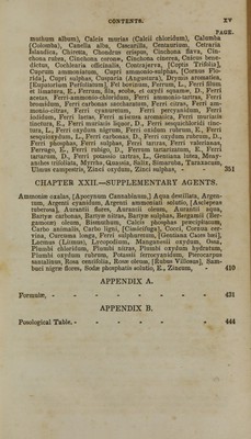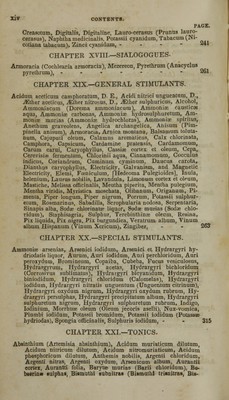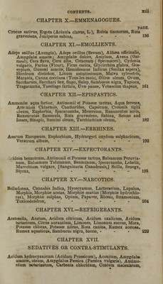 ![CHAPTER X—EMMENAGOGUES. PAGE. Crocus sativns, Ergota (Acinula clavus, L.), Rubia tinctorum, Ruta graveolens, Juniperus sabina, .... 156 CHAPTER XI.—EMOLLIENTS. Adeps suillus (Axungia), Adeps ovillus (Sevum), Althaea officinalis, Amygdalae amarae; Amygdalae dulces, Amylum, Avena (Oat- meal), Cera flava, Cera alba, Cetaceum ( Spermaceti), Cydonia vulgaris, Farina (Flour), Ficus carica, Glycirrhiza glabra, Gos- sypium, Gummi acaciae, Hemidesmus Indicus (Srnilax aspera), Hordeum distichon, Linum usitatissimum, Malva sylvestris, Maranta, Canna coccinea (Tous-les-mois), Olivae oleum, Ovum, Saccharum, Sacchari faex, Sago, Salep, Sambucus nigra, Tapioca, Tragacantha, Tussilago farfara, Uvae passae, Vebascum thapsus, 161 CHAPTER XII.—EPISPASTICS. Ammoniae aqua fortior, Antimonii et Potassae tartras, Aqua fervens, Arte nisia Chinensis, Cantharides, Capsicum, Crotonis tiglii oleum, Euphorbia, Ipacacuanha, Mezereum, Ranunculus acris, Ranunculus flammula, Ruta graveolens, Sabina, Setons and Issues, Sinapis, Succini oleum, Terebinthinae oleum, - 182 CHAPTER XIII.—ERRHINES. Asarum Europaeum, Euphorbium, Hydrargyri oxydum sulphuricum, Veratrum album, ---... 192 CHAPTER XIV.—EXPECTORANTS. . idum benzoicum, Antimonii et Potassae tartras, Balsamum Peruvia- num, Balsamum Tolutanum, Benzoinum, Ipecacuanha, Lobelia, Marrubium vulgare, [Sanguinaria Canadensis,] Scilla, Senega, Styrax, -----_- 195 CHAPTER XV—NARCOTICS. Belladonna, Cannabis Indica, Hyoscyamus, Lactucarium, Lupulus, Morphia, Morphiae acetas, Morphiae murias (Morphiae hydrochlo- ras), Morphiae sulphas, Opium, Papaver, Rhceas, Stramonium, Toxicodendron, ...... 204 CHAPTER XVI.—REFRIGERANTS. Acetcoella, Acetum, Acidum citricum, Acidum oxalicum, Acidum tartaricum, Citrus aurantium, Limones, Limonum succus, Mora, Potassae chloras, Potassae nitras, Rosa canina, Rumex acetosa, Rumex aquaticus, Sambucus nigra, baccae, ... 232 CHAPTER XVII. SEDATIVES OR CONTRA-STIMULANTS. Acidum hydrocyanicum (Acidum Prussicum), Aconitum, Amygdalaa amarae, oleum, Amygdalus Persica (Persica vulgaris), Antimo- nium tartarizatum, Carbonis chloridum, Conium malculatum,](https://iiif.wellcomecollection.org/image/b21143602_0019.jp2/full/800%2C/0/default.jpg)