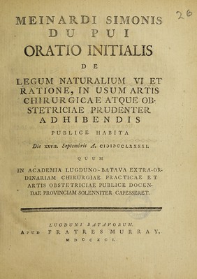 Oratio initialis de legum naturalium vi et ratione, in usum artis chirurgicae atque obstetriciae prudenter adhibendis / [Meinard Simon du Pui].