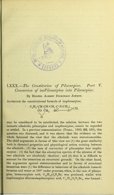 Credit: The constitution of pilocarpine. Pt. V. Conversion of isopilocarpine into pilocarpine / by H.A.D. Jowett. Source: Wellcome Collection.