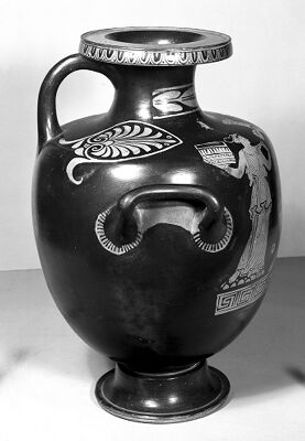 M0016189EB: Hydria (water carrier) showing two women with offerings at an altar, from Southern Italy, 4th century BC