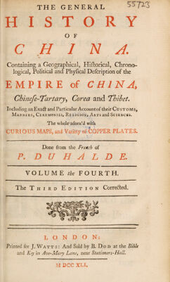The general history of China. Containing a geographical, historical, chronological, political and physical description of the empire of China, Chinese-Tartary, Corea, and Thibet. Including an exact and particular account of their customs, manners, ceremonies, religion, arts and sciences ... / Done from the French of P. Duhalde ... [by R. Brookes].