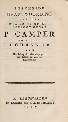 Bescheide beantwoording van den ... hooggeleerden heere P. Camper door den schryver van Het belang der maatschappye in het beteugelen van den kindermoord [A. Sterk] / [Augustus Sterk].