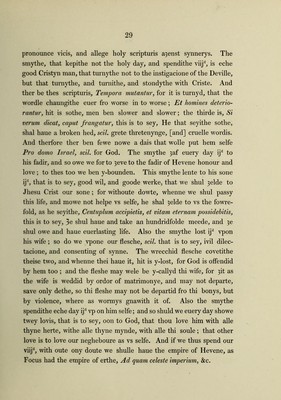 ![pronounce vicis, and allege holy scripturis a3enst synnerys. The smythe, that kepithe not the holy day, and spendithe viijd, is eche good Cristyn man, that turnythe not to the instigacione of the Deville, but that turnythe, and turnithe, and stondythe with Criste. And ther be thes scripturis, Tempora mutantur, for it is turnyd, that the wordle chaungithe euer fro worse in to worse; Et homines deterio- rantur, hit is sothe, men ben slower and slower; the thirde is. Si verum dicat, caput frangatur, this is to sey. He that seyithe sothe, shal haue a broken bed, scil. grete thretenynge, [and] cruelle wordis. And therfore ther ben fewe nowe a dais that wolle put hem selfe Pro domo Israel, scil. for God. The smythe jaf euery day ijd to his fadir, and so owe we for to 3eve to the fadir of Hevene honour and love ; to thes too we ben y-bounden. This smythe lente to his sone ijd, that is to sey, good wil, and goode werke, that we shul 3elde to Jhesu Crist our sone; for withoute dowte, whenne we shul passy this life, and mowe not helpe vs selfe, he shal 3elde to vs the fowre- fold, as he seyithe, Centuplum accipietis, et vitarn eternam possidebitis, this is to sey, 3e shul haue and take an hundridfolde meede, and 3e shul owe and haue euerlasting life. Also the smythe lost ijd vpon his wife ; so do we vpone our flesche, scil. that is to sey, ivil dilec- tacione, and consenting of synne. The wrecchid flesche covetithe theise two, and whenne thei haue it, hit is y-lost, for God is offendid by hem too ; and the fleshe may wele be y-callyd thi wife, for 3k as the wife is weddid by ordor of matrimonye, and may not departe, save only dethe, so thi fleshe may not be departid fro thi bonys, but by violence, where as wormys gnawith it of. Also the smythe spendithe eche day ijd vp on him selfe; and so shuld we euery day showe twey lovis, that is to sey, oon to God, that thou love him with alle thyne herte, withe alle thyne mynde, with alle thi soule; that other love is to love our negheboure as vs selfe. And if we thus spend our viijd, with oute ony doute we shulle haue the empire of Hevene, as Focus had the empire of erthe, Ad quam celeste imperium, &c.](https://iiif.wellcomecollection.org/image/b22007118_0037.jp2/full/800%2C/0/default.jpg)