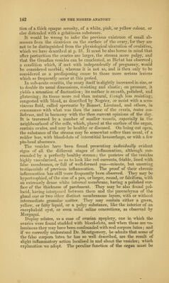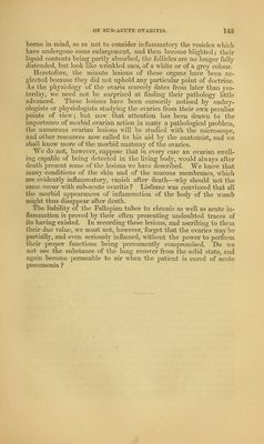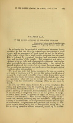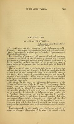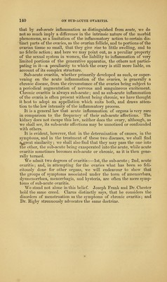 ![CHAPTEE XIII. ON SUB-ACUTE OVAEITIS. Inflammation is more frequently sub- acute than acute. Stn.— Clironic ovaritis; secondary pelvic inflammation. — Dr. Kennedy. Abdominal inflammation—Menstrual colics—Amenor- rlioea—Dj^smenorrhee hysteralgiqne.—G-endrin. Dysmenorrlicea— Menoi'rliagia—Hysteria. Dee.—Swelling of the ovaria, v^ith increase of lieat, and pain upon pressure, accompanied by intermittent or permanent pain or uneasi- ness in tlie ovarian region, radiating to the loins and tbighs, and pro- ducing, according to the constitution of the patient, an arrest of menstruation, or its profuse S.o'w, intense local pain, or hysterical symptoms. We are not called upon to inquire into the nature of inflammation, and accepting the term as it is usually defined, we submit that in the present state of oiu' knowledge it would be unjustifiable presump- tion to deny the existence of inflammation, except when proved by purulent or solid deposits. When mucous membranes are inflamed, as in gleet or ophthalmia, the anatomist can often discover nothing but doubtful hyper^emia. Mr. Simon, in his paper on Sub-acute Inflammation of the Kidney—Transactions of tlie R. M. and 0. Society—correctly ob- serves, that what is notoriously true for mucous membranes is no doubt equally so, though less notoriously, in respect to glands. ]No intestinal effusion of lymph need exist in a gland to Avarrant us in accounting it inflamed; its inflammation may consist only in functional derangements, and may be recognised by admixing its albuminous products with those of normal secretion; but while a mucous membrane sheds its inflammatory secretions, and gets rid of them, the glands are embarrassed by tlie retention of these secre- tions, and thus an irritation, insignificant as it may be, on a mucous memlDrane in a gland, may serve to originate its complete disorganisa- tion. Leaving the reader to apply to the ovary Mr. Simon's train of rea- soning on sub-acute inflammation of the kidney, we proceed to state](https://iiif.wellcomecollection.org/image/b21081189_0163.jp2/full/800%2C/0/default.jpg)