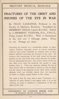 Fractures of the orbit : and injuries to the eye in war / by Félix Lagrange ; translated by Herbert Child ; edited by J. Herbert Parsons.