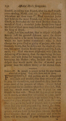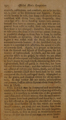 Credit: The afflicted man's companion: or a directory for persons and families, afflicted with sickness, or any other distress. With directions to the sick, both under and after affliction. Also, directions to the friends of the sick, and others who visit them. And likewise to all, how to prepare both for sickness and death; and how to be exercised at the time of dying. To which is added, a collection of comfortable texts of scripture, very suitable for dying believers. The choice sayings of many eminent dying saints. The author's last advice to his wife and children: and his dying words / written by himself, and found among his papers after his death. Very necessary for all families. By John Willison. Source: Wellcome Collection.