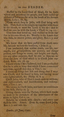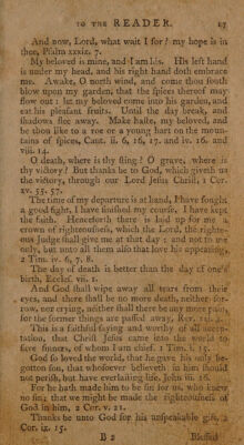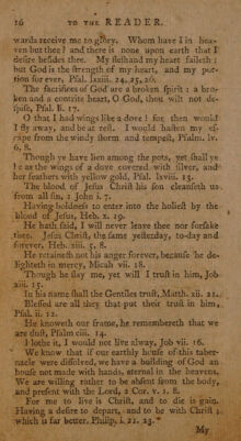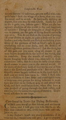 Credit: The afflicted man's companion: or a directory for persons and families, afflicted with sickness, or any other distress. With directions to the sick, both under and after affliction. Also, directions to the friends of the sick, and others who visit them. And likewise to all, how to prepare both for sickness and death; and how to be exercised at the time of dying. To which is added, a collection of comfortable texts of scripture, very suitable for dying believers. The choice sayings of many eminent dying saints. The author's last advice to his wife and children: and his dying words / written by himself, and found among his papers after his death. Very necessary for all families. By John Willison. Source: Wellcome Collection.
