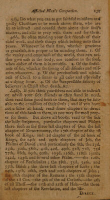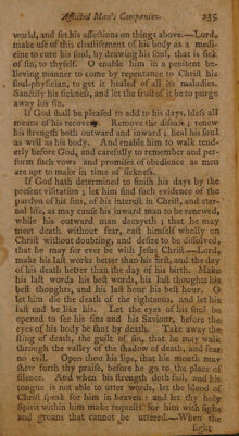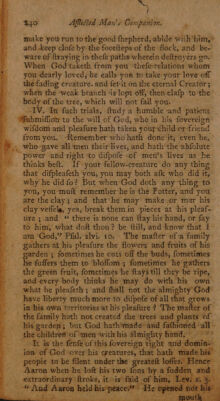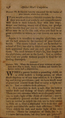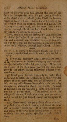 Credit: The afflicted man's companion: or a directory for persons and families, afflicted with sickness, or any other distress. With directions to the sick, both under and after affliction. Also, directions to the friends of the sick, and others who visit them. And likewise to all, how to prepare both for sickness and death; and how to be exercised at the time of dying. To which is added, a collection of comfortable texts of scripture, very suitable for dying believers. The choice sayings of many eminent dying saints. The author's last advice to his wife and children: and his dying words / written by himself, and found among his papers after his death. Very necessary for all families. By John Willison. Source: Wellcome Collection.