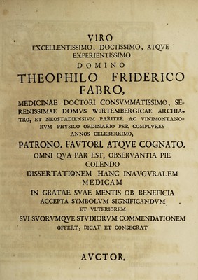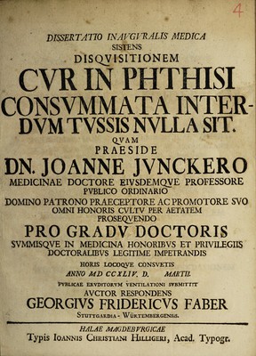 Credit: Dissertatio inauguralis medica sistens disquisitionem cur in phthisi consummata interdum tussis nulla sit ... / [Georg Friedrich Faber]. Source: Wellcome Collection.