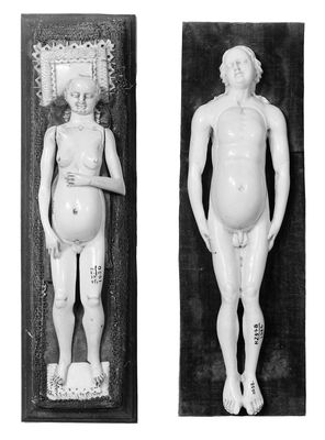 Credit: M0018668EA: Anatomical figures in ivory; one pregnant female and one male. Source: Wellcome Collection.