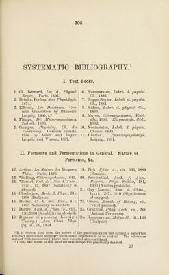 ![25. Hansen, Arb. a. d. hot. Inst., Wurzburg., iii. 26. Hoppe-Seyler, Pflilg. Arch., xii. (Section on ferments). 27. Hiifner, J. pract. Ch., N.S., x., 148, 385, 1874 (Catalysis). 28. Jacobson, Z. phys. Ch., xvi., 367, 1892. (H202.) 29. de Jager, Virch. A., cxxi., 182, 1890. 30. Kassowitz, Allgem. Biol.,Vienna, 1899. 31. Kopp, Geschichte der Chemie, iv., 285 et seq. 32. Latschenberger, C. f. Phys., iv., No. 1, 1890 (Fields experiments on Rennet). 33. Lea and Dickinson, J. of Physiol., xi., 307 (Fick’s exp. on Rennet). 34. Lea, Proc. Royal Soc., xxxvi., 55, 1883 (Dialysis). 35. 36. Liebig, Ann. d. Chem. u. Pharm., lx., 1; cliii., 1. 37. Liebig, Chem. Briefe, 1865, Brief, 2L . 38. Loew, Pflilg. Arch., xxii., 503, 1880 (Nature of ferments). 39. Loew, Pflilg. Arch., xxvii., 203, 1882 (Nature of ferments). 40. Loew, Science, 955, 1899. 41. Macfadyen, Journ. of Anat. and Phys., xxvi., 409, 1892 (Nature of ferments). 9. A. Mayer, Enzymologie, Heidel- berg, 1882. Gahrungschemie, ibid., 1895. 42. Medwedew, Pflilg. Arch., lxv., 249, 1897 (Nat. of ferments). 43. Moraczewski, Pflilg. Arch., lxix., 32, 1898 (Nat. of ferments). 44. Naegeli, Theorie der Gahrung, Munich, 1879. 45. Pekelharing, Z. phys. Ch., xxii., 1896-7. 46. Sacharoff, C. f. Balcter., xxiv., 661, 1898. 47. Schonbein, J. pr. Ch., lxxxi., 334. (H202.) 48. Schiitzenberger, Die Gahrungs- erscheinungen. Internat. wiss. Bibl., 1875. 49. Stohmann, Z. f. Biol., xxxi., 385. 50. Tizzoni and Cattani, Arch. ital. d. Biolog., xiv., 105 (F. and toxines). 51. Traube, Collected Treatises, Berlin, 1899. 52. Walther, Pflilg. Arch., xlviii., 529 (Fick’s expts. on Rennet). 53. Wolffhiigel, Pflilg. Arch., vii., 188 (Dialysis). III. The Mode of Action of Ferments and Influence of External Factors.1 54. Albertoni, Centralbl. med. Wiss., 1878, No. 36 (Coagulation of blood). 55. d’Arsonval, C. R. Soc. Biol., xliv., 808, 1892 (Cold). 56. Arthus and Huber, Arch. d. Physiol. [5], iv., 651, 1892 (Sodium fluoride). 57. Baum, On Antagonism, Diss. Rostock, 1892. 58. Bechamp, Comptes Rend., lxxv., 337. 59. Bert, Comptes Rend., lxxx.,1579 (Compressed O). 60. Biernacki, Z. f. Biol., xxviii., 62. 61. Bouchardat, Ann. Chim. Phys. [3], xiv., 61 (Ethereal salts). 62. Buchner, Arch. f. Tdin. Med., xxix., 537 (Alcohol). 63. Camus and Gley, C. R. Soc. Biol., xlix., 825, 1897 (Serum). 64. Chabrie, C. R. Soc. Biol., 105, 1898. 65. Chittenden and Ely, Journ. oj Physiol., iii., 327 (Peptone). 66. Chittenden and Griswold, Amer. Chem. J., iii., 1882. Only those references are given here which relate to influences on more than one individual ferment.](https://iiif.wellcomecollection.org/image/b21900401_0324.jp2/full/800%2C/0/default.jpg)
