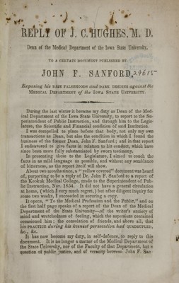 Credit: Reply to a certain document published by John F. Sanford, exposing his base falsehoods and dark designs against the medical department of the Iowa State University. Source: Wellcome Collection.