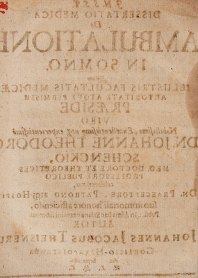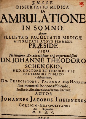 Dissertatio medica de ambulatione in somno ... / praeside ... Johanne Theodoro Schenckio, ... submittit autor Johannes Jacobus Theisnerus.