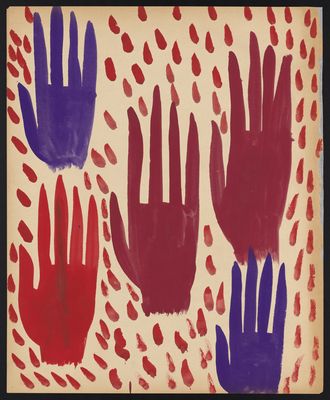 Credit: Five hands in red and purple surrounded by red droplets. Source: Wellcome Collection.