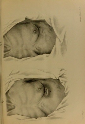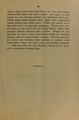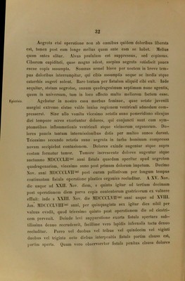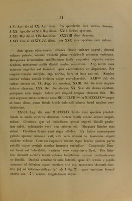![A V. Apr. die ad XX. Apr. diem. Per quindecim dies vulnus clausum, A XX. Apr. die ad XII. Maji diem. XXII diebus apertum, A XII. Maji die ad XIX. Jun. diem. XXXVIII dies clausum, AXIX.,lun. d. ad XIX.,lul. diem, per XXX dies apertum erat vulnus. ,Iam quum observaretur dolores clauso vulnere augeri, diminui vulnere patente, omnino vulneris plane recludendi rationem omisimus. Reliquimus forarninulam subtilissimam facile emplastro imposito reclu- dendam, mensuram capitis dimidii aculae aequantem. Arg. nitrici usus externus aegrotae est beneficio, quia excoriationes eo disparuere. Per longum tempus morphio, arg. nitrico, ferro et lacte usa est. Saepius interea vulnus coaluit vicissim atque recrudescebat. XXIP^o ,Iul. die vulnus siccum est, IX. Aug. die apertum, XXIII. Oct. die inter magnos dolores clausum, XXX. Oct. die siccum, XX. Nov. die denuo apertum, postquam cum magno dolore per aliquod tempus clausum fuit. Hic erat aegrotae status vertente anno MDCCCLVIIP”^® et MDCCCLIX’*® usque ad hunc diem, quum fistula lapide infernali admoto haud amplius con- cluderetur. XXVII. Aug. die anni MDCCCLIX fistula hanc speciem praebet: fistula in media cicatrice dimidiam partem capitis aculae aequat magni- tudine. Circuitus ejus ad latitudinem grossi argenti dimidii paulu- lum rubet, epidermide vero non orbatus est. Margines fistulae sunt obtusi. Cicatrices firmae sunt atque albidae. Ex fistula nonnunquam guttula spumae mucosae exit, cibi vero nonnisi in tussiendo aliquid evadere videtur. Ceterum emplastro minimo atque lamina quadam parva pulvillo atque corrigia elastica instructa recluditur. Compressio fistu- lae haud est tolerabilis], ventrem vero comprimere licet. Per fistu- lam decurrit cicatrix tenuis suturae longitudine quatuor centimetrorum et dimidii. Duobus centimetris infra fistulam, quae 4/2 centim. a papilla mammae ad inferiora atque interiora sila est, transverse decurrit cica- trix (/>) ad inferiora defiexa (cf. tab. I, fig. 2), quae incisione laterali exorta est. 7 ''j centim. longitudinem aequat.](https://iiif.wellcomecollection.org/image/b22393018_0039.jp2/full/800%2C/0/default.jpg)