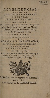 Advertencias dos meios que os particulares podem usar para preservar-se da peste, conforme o que tem ensinado a experiencia principalmente na peste de Marselha em 1720, de Toulon em 1721, e de Moscou em 1771 / compiladas por hum socio da Academia R. das Sciencias, e por ella mandadas imprimir em beneficio da saude publica.