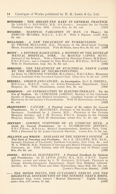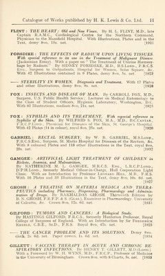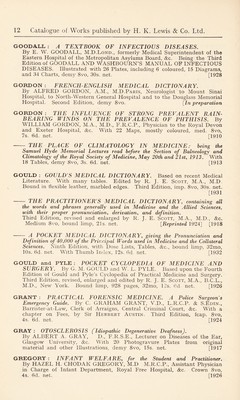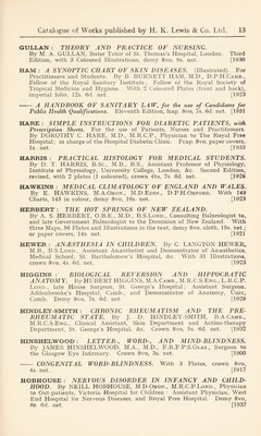 ![LAWRENCE : THE DIABETIC A-B-C. By R. D. LAWRENCE, M.A., M.D., M.R.C.P., Chemical Pathologist, King’s College Hospital. Second Edition, demy 8vo, 3s. 6d. net. [1932 THE LINE-RATION SCHEME. A Simple Diabetic Diet. 6d. net. (See page 32) LEITCH : THE USE OF STANDARD TREATMENTS IN THE CAMPAIGN AGAINST DISEASE IN THE TROPICS. By J. NEIL LEITCH, M.D., B.S.Lond., M.R.C.S.Eng., D.T.M. & H.Eng., Pathologist, West African Medical Service. With an Introduction by G. Carmichael Low, F.R.C.P. With 4 Plates, demy 8vo, 6s. net. [1929 LEWIS : A MANUAL OF MEDICAL EXERCISES. By Dr. PERCY LEWIS, Hon. Medical Officer to the Victoria Hospital, and Surgeon to St. Andrew’s Convalescent Home, Folkestone. Second Edition, enlarged, with Illustrations, 16mo, 2s. net. [1910 LEYS; CHRONIC PULMONARY CATARRH. By DUNCAN LEYS, M.B.Oxon, M.R.C.P., John and Temple Research Fellow in Diseases of Children, St Thomas’s Hospital. With Illustrations, demy 8vo, 7s. 6d. net. [1927 LINDSAY : MEDICAL AXIOMS, APHORISMS, AND CLINICAL MEMORANDA. By JAMES A. LINDSAY, M.A., M.D., F.R.C.P.Lond., late Emeritus Professor of Medicine in the Queen’s University of Belfast. Crown 8vo, 6s. net. [Second impression] [1923 AMONG THE THINKERS : Leaves from my Note Books. Crown 8vo, 5s. net. [1931 LINT : ATLAS OF THE HISTORY OF MEDICINE. Part I. ANATOMY. By Dr. J. G. DE LINT, Lecturer on the History of Medicine at the University at Leiden. With a Foreword by Charles Singer, M.D. With 199 Illustrations, 15s. net. [1926 LITTLE : ARTIFICIAL LIMBS AND AMPUTATION STUMPS. A Practical Handbook. By E. MUIRHEAD LITTLE, F.R.C.S., Consulting Surgeon to the Royal National Orthopaedic Hospital; Surgeon to the Royal Surgical Aid Society, &c. With 267 Illustrations, demy 8vo, 18s. net. [Lewis’s Practical Series]. [1922 LOVE : A SHORTER SURGERY. A Practical Manual for Senior Students. By McNEILL LOVE, M.S.Lond., F.R.C.S.Eng., Surgeon, Royal Northern Hospital; Hunterian Professor, Royal College of Surgeons, &c. Third Edition, thoroughly revised. With 96 Illustrations, demy 8vo, 16s. net. [1932 LUMB : THE SYSTEMATIC TREATMENT OF GONORRHOEA IN THE MALE. By NORMAN LUMB, O.B.E., M.B., B.S.Lond., F.R.C.S. Eng., Late R.A.M.C. Specialist in Venereal Diseases and Officer-in-Charge of Division, 39 and 51 General Hospitals, B.E.F. Second Edition, crown 8vo, 5s. net, [1920 McCLEARY : NATIONAL HEALTH INSURANCE. By G. F. McCLEARY, B.A.Camb., M.D., D.P.H., formerly Principal Medical Officer, National Health Insurance Commission (England) and Deputy Senior Medical Officer, Ministry of Health. Crown 8vo, 6s. net. [1932 - THE EARLY HISTORY OF THE INFANT WELFARE MOVE- MENT. With 6 Portraits, Crown 8vo, 6s. net. [1933](https://iiif.wellcomecollection.org/image/b29821964_0192.jp2/full/800%2C/0/default.jpg)