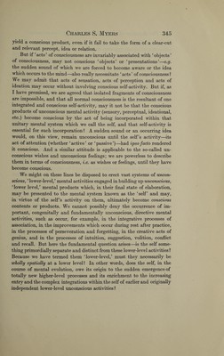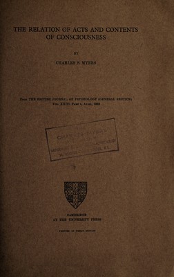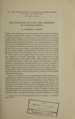 The relation of acts and contents of consciousness / by Charles S. Myers.