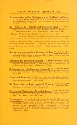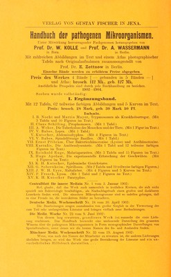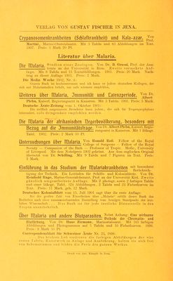![Crypanosomenhrankbeiten ($d)]afkrank])eit) und Kala-azar, ^^'^^ Martini, Marine-Oberstabsarzt. Mit 3 Tafeln und 63 Abbildungen im Text. 1907. Preis: 1 Mark 20 Pf. Literatur über Malaria. Die TDalaria Studien eines Zoologen. Von Dr. B. Grassi, Prof. der Ana- 1 tomie an der Universität in Rom. Zweite vermehrte Auf- lage. Mit 8 Tafeln und 15 Textabbildungen. 1901. Preis: 20 Mark. Nach- trag zu dieser Auflage 1903. Preis: 2 Mark. Die Mediz. Woche 1902, Nr. 4: Grassis Bucli ist hochinteressant und ich kann es jedem deutschen Kollegen, der sich mit Malariastudien befaßt, nur aufs wärmste empfehlen, löeiteres über nialaria, Jmmunität und Eatenzperlode. ^'^^^^^l Plehn, Kaiserl. Regierungsarzt in Kamerun. Mit 3 Tafeln. 1901. Preis: 5 Mark. Deutsche Ärzte-Zeitung vom 1. Oktober 1901: Die trefflich ausgestattete Broschüre kann jedem, der sich für Tropenprophylaxe interessiert, aufs dringendste empfohlen werden. Die TDalaria der afrikani$d)en Hegerbeuölkerung, besonders mit Bezug auf die Jmmunitätsfrage. ^'°^^f^'^'il't^^^*^°'^\^j^^^^^^^ 2 2— rungsarzt m Kamerun. Mit 1 lithogr. Tafel. 1902. Preis: 2 Mark 50 Pf. Untersud)ungen über rßalaria. J^ ^f^ ^^^ ^^^,^7 «^^J,« g«y^} . 2 College ot burgeons — JbeUow oi the Royal Society — Companion of the Bath — Professor of Tropic. Medic, üniversity of Liverpool. Mit dem Nobelpreis 1902 gekrönt. Aus dem englischen Original übersetzt von Dr. Schilling. Mit 9 Tafeln und 7 Figuren im Text. Preis: 3 Mark. Ginfübrung in das Studium der rßalariakrankbeiten ^J! besonderer 2 '. Berücksich- tigung der Technik. Ein Leitfaden für Schiffs- und Kolonialärzte. Von Dr. Reinhold Rüge, Marine-Generaloberarzt, Prof. an der Universität Kiel. Zweite gänzlich umgearbeitete Auflage. Mit 2 photogr. sowie 2 farbigen Tafeln und einer lithogr. Tafel, 124 Abbildungen, 3 Tafeln und 23 Fieberkurven im Text. Preis: 11 Mark, geb. 12 Mark. Deutsches Koloiiialblatt vom 15. Juli 1901 sagt über die erste Auflage: Bei der großen Zahl von Einzelheiten über ,,Malaria erfüllt dieses Buch das Bedürfnis nach einer zusamnnenfassenden Darstellung vom heutigen Standpunkt der ärzt- lichen Wissenschaft. . . Das Buch ist für jede ärztliche Dienststelle in den Tropen unentbehrlich. Über rnaiaria und andere Blutparasiten. S'I'f/^^n?^ wirksame JPctbodc der Cbromatin- und Blutfärbung. Von Dr. Hans Ziemann, Marinestabsarzt. Mit 165 farbigen Abbilduneen und Photogrammen auf 5 Tafeln und 10 Fieberkurven. 1898. Preis: 8 Mark 50 Pf. Correspondenzblatt für Schweizer Ärzte Nr. 23, 1898: . . . Das höchste Lob verdienen die farbigen Abbildungen der vier ersten Tafeln; Kunstwerk in Anlage und Ausführung, halten sie sich frei von Schematismus und bilden die Perle des ganzen Werkes. Druck von Aiit. Kämpfe in Jena.](https://iiif.wellcomecollection.org/image/b21174842_0090.jp2/full/800%2C/0/default.jpg)