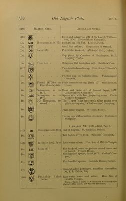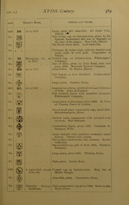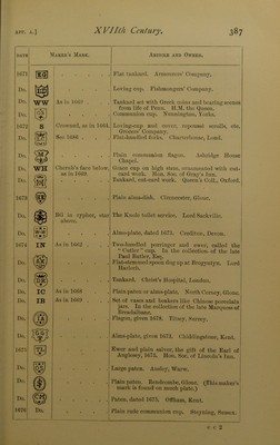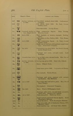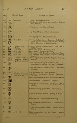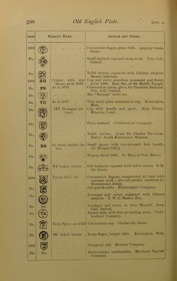 ![DATE Makeh’s Mark. 1 Article and Owner. 1682 (I-W) 1 . Communion flagon, given 1683. Ampiiey fhucis, Glouc. Do. . Small tankard, repousse* strap-work. 'rrin. Coll., Oxford. Do. 1683 Do. Do. FS [pkI Cj'plier with star above, as in 1673. As in 1676 Toilet service, engraved with Chinese subjects, Messrs. Lambert, Cu2) and cover, acanthus onrament and fluted, given 1683. Hon. Soc. of the Middle Temple. Communion jraten, given by President Bathurst, Trin. Coll., Oxford, The “ Berners” toilet set. Do. Do. 1 TO As in 1677 (EV Damaged let- ters) Very small jdain communion cup, Kensington, Midx. Cup with handle and .spout. Holy Trinity, Minoiies, Lond. Do. 1^1 Plain tankard. Clothworkers’ Comirany. Do. . Toilet service. (Late Sir Charles Trevelyan, Bart.) South Kensington Museum. Do. RS In heart, mullet be- low. Small s^roon, with two-pronged fork handle. (0. Morgan Coll.) Do. . Flagon, dated 1683. St, Maiy-lc-Port, Bristol. Do. WF linked lettcis . Gilt tankards repouss6 with battle-scenes. H.1\I. j the Queen. 1684 Do. 1 Found 1677—63 Communion flagons, ornamented all over with repouss6 work ; also tall jrricket candlesticks. Westminster Abbey. Gilt punch-ladle. Fishmongers’ Company. Do. uKCa Porringer and cover, engraved with Chinese subjects. T. W. C. Master, Esq. Do. Do. Do. © Porringer and cover, ex dono Mansell. Jesus Coll., Oxford. ! Square salts, with four projecting arms. Cloth- workers’ Company. Do. G$r!) [Pj Denj. Pyne; see 1723 Communion cu^r. Chedworth, Glouc. | . Do. # SH linked letters Large flagon, bought 1685. Kensington, l\Iidx. 1 1 1685 Do. • • • • • ; 1 i Octagonal salt, Mercei-s' Company. Do. . Doric-colum]! candlesticks. Merchant Taylors Com])any.](https://iiif.wellcomecollection.org/image/b24855273_0416.jp2/full/800%2C/0/default.jpg)