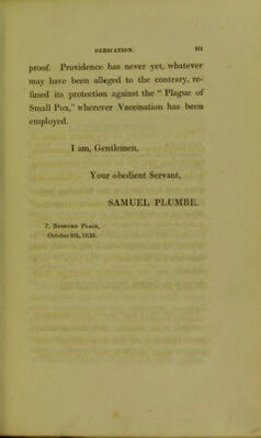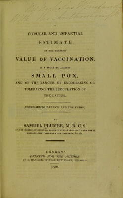 A popular and impartial estimate of the present value of vaccination, as a security against small pox, and of the danger of encouraging or tolerating the inoculation of the latter. Addressed to parents and the public / by Samuel Plumbe.